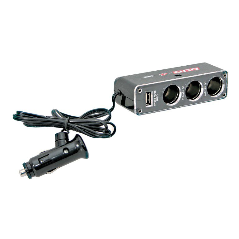 Αντάπτορας 3 θέσεων (πολύπριζο) και 1 θύρας USB 12/24 V για χρήση στο φις του αναπτήρα του οχήματος, ιδανικό για να συνδέετε ή να φορτίζετε πολλές ηλεκτρονικές συσκευές παράλληλα κατά την οδήγηση ή τη διάρκεια ταξιδιού. Διαθέτει LED λαμπάκι, ασφάλεια λειτουργίας και αυτοκόλλητη ταινία για την τοποθέτησή του σε επίπεδες επιφάνειες. Οι υποδοχές (πρίζες) είναι συμβατές με απλού τύπου (standard) αντάπτορες και καλώδια φόρτισης αυτοκινήτου και το πολύπριζο είναι εξοπλισμένο με 90 cm καλώδιο. Ιδανική λύση για να συνδέεται MP3, iPods και άλλες ηλεκτρονικές συσκευές. Εύκολη και γρήγορη χρήση.