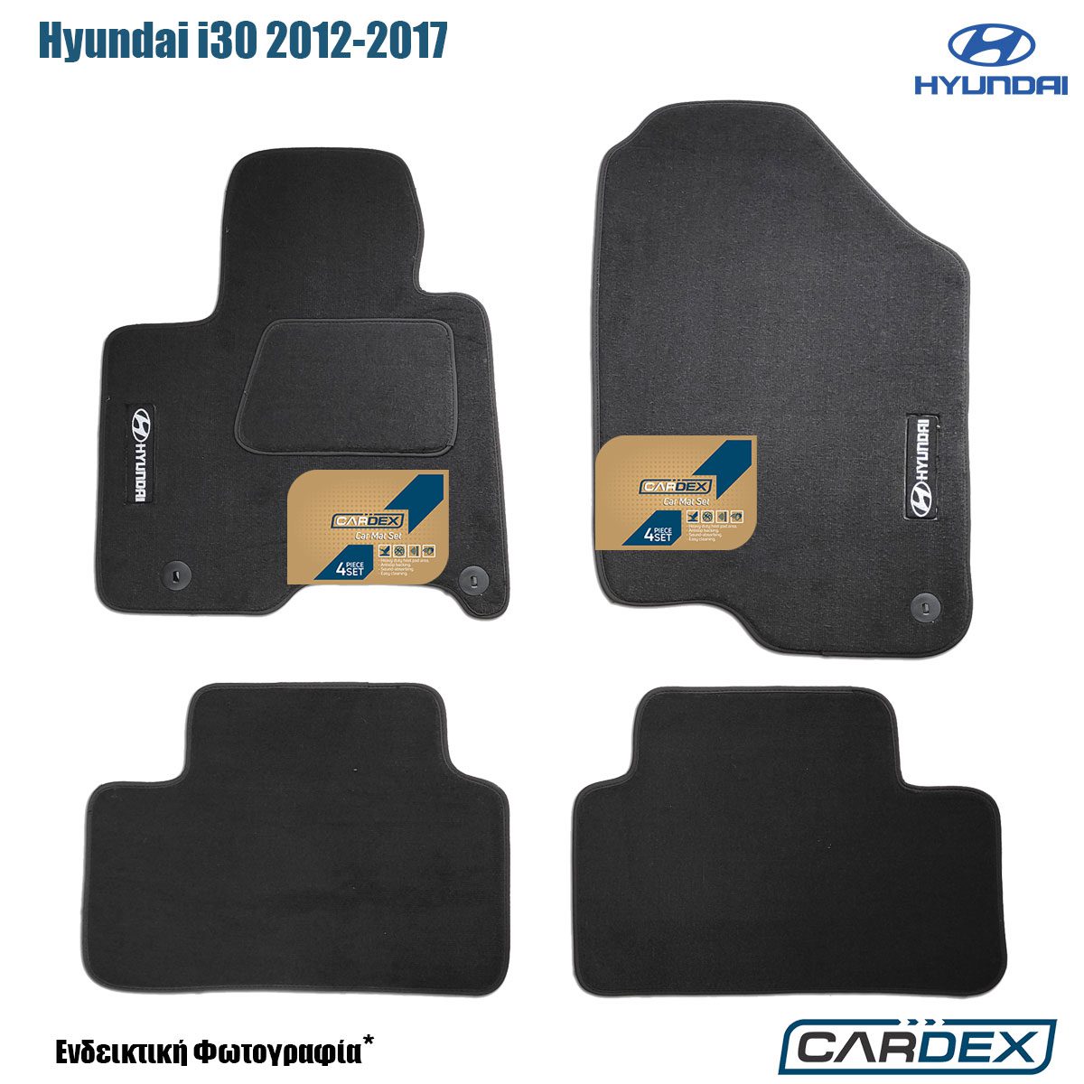 Πατάκια Αυτοκινήτου Hyundai i30 2012-2017 μαρκέ μοκέτα μαύρη με λογότυπο, ποιότητας Velourtec™ και κουμπώματα στον οδηγό και τον συνοδηγό, από την εταιρία Cardex®