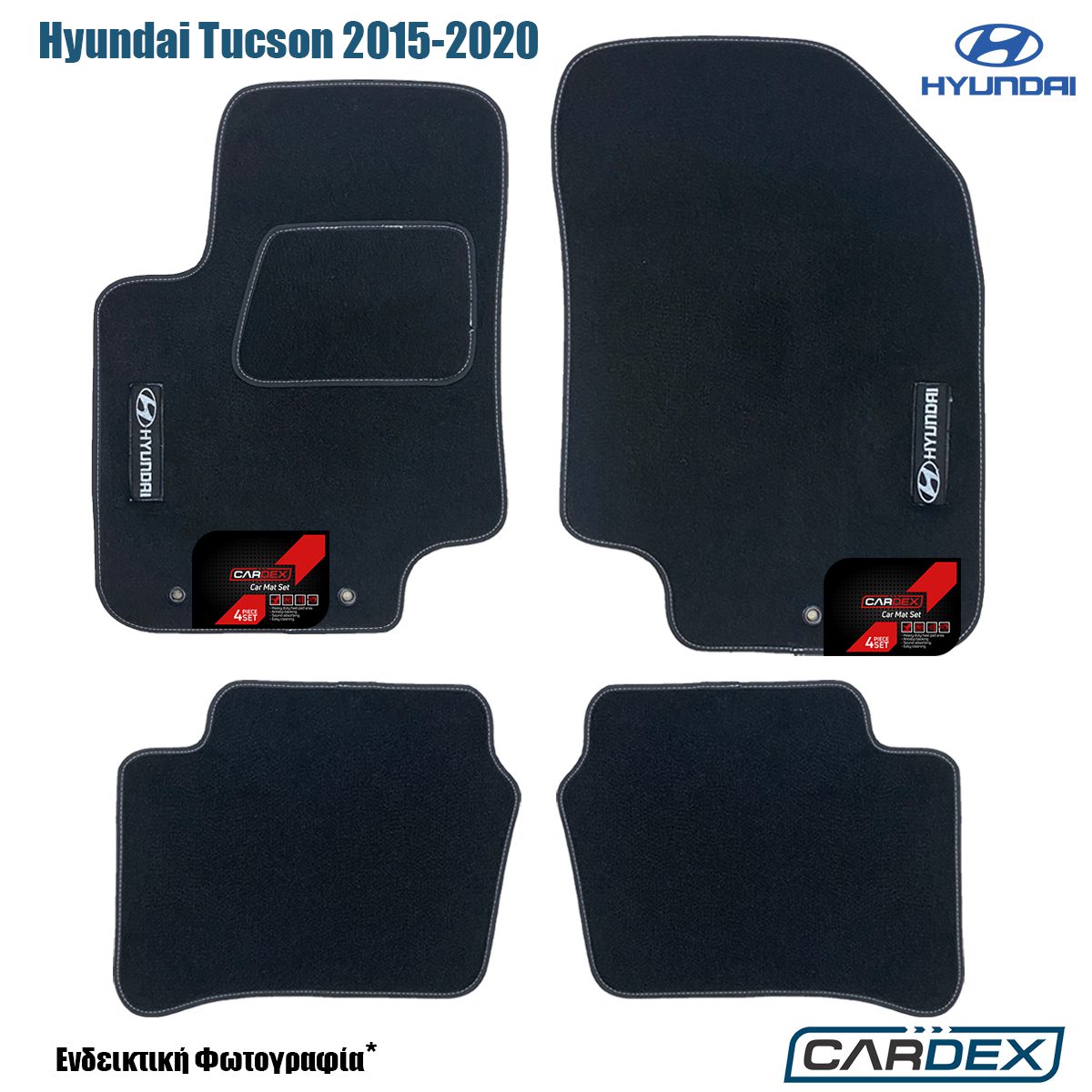 Πατάκια αυτοκινήτου Hyundai Tucson 2015-2020 μαρκέ μοκέτα μαύρα με λογότυπο ποιότητας Eco-Line και κουμπώματα στον οδηγό και τον συνοδηγό, από την εταιρία Cardex®
