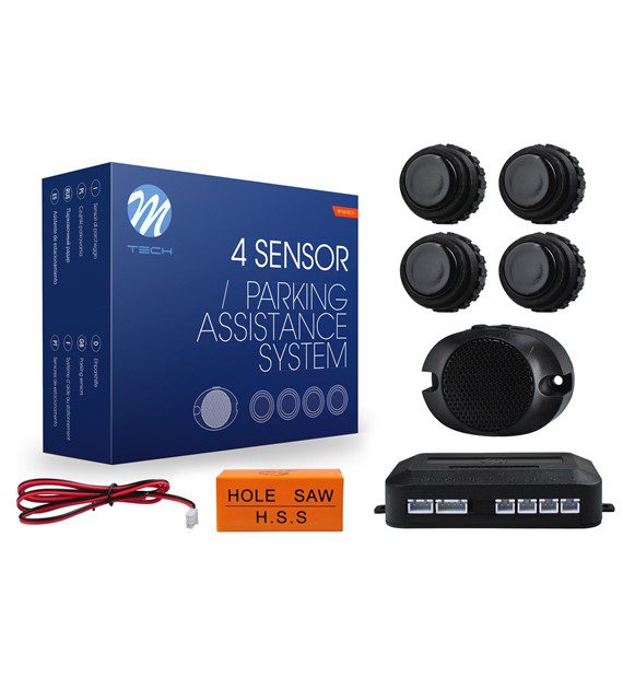 Σύστημα παρκαρίσματος 12v με 4 μαύρους αισθητήρες 22mm και επιπλέον δαχτυλίδι και buzzer, απο την εταιρεία M-TECH, πολωνικής προέλευσης.